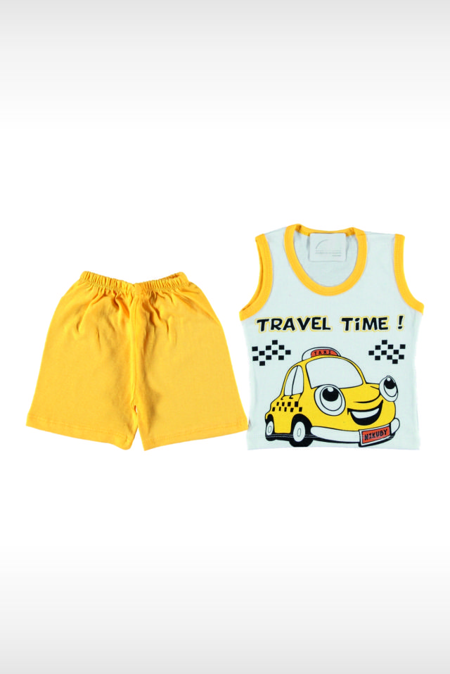 Üzerinde “Travel Time” baskısı bulunan erkek çocuk penye takımı